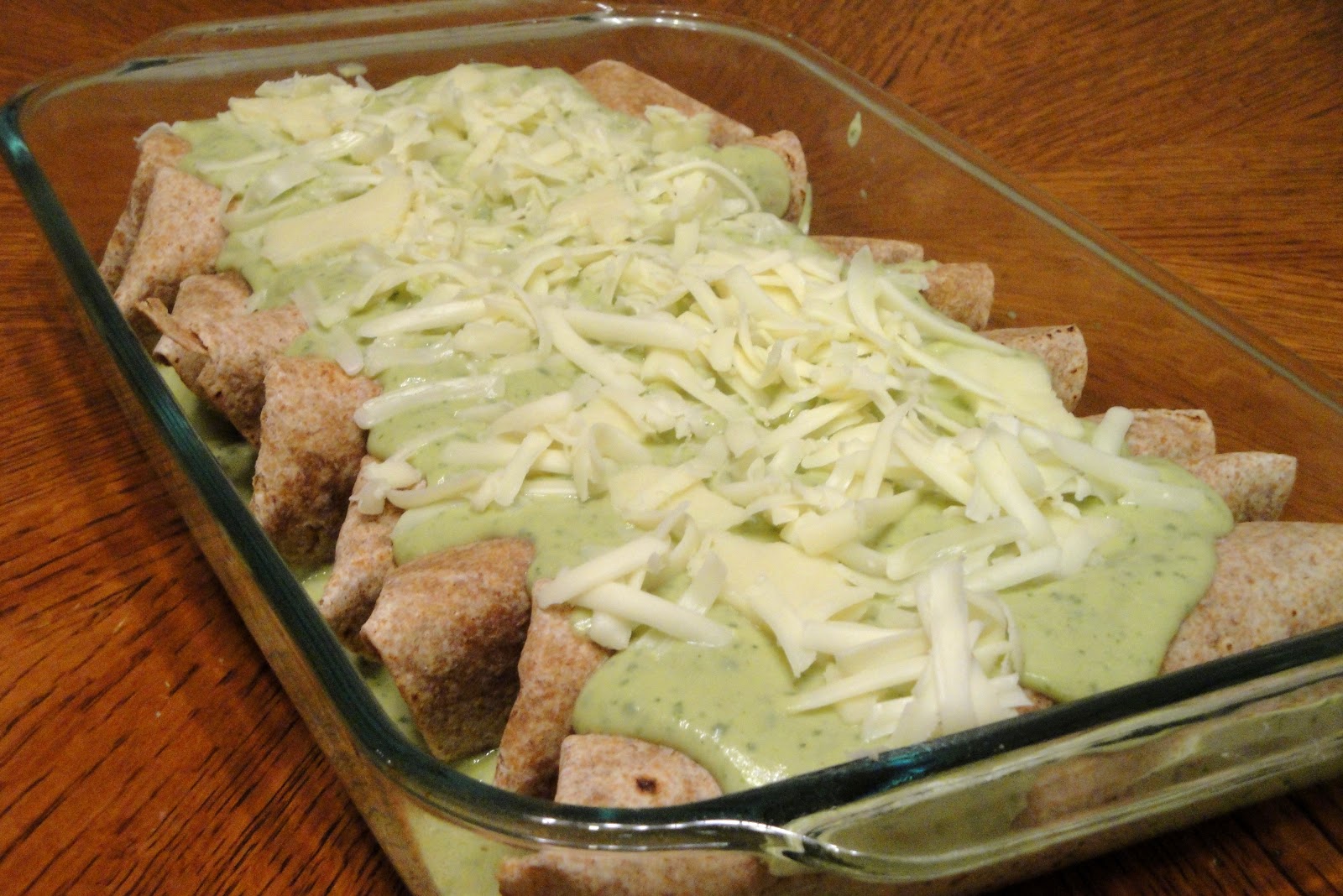 Spread a little avocado sauce over the bottom of the prepared pan. To assemble the enchiladas, place a tortilla on a flat surface. Spread some avocado sauce on the top 1/3 of the tortilla. Top with the chicken mixture and shredded cheese. Repeat until the pan is full or you have used all the filling. Spread the remaining avocado sauce over the top of the enchiladas. Top with remaining shredded cheese. Spray a piece of foil with nonstick spray and cover the pan with the spray-side down. Bake for 20 minutes or until the dish is heated through and the tortillas being to harden. Serve and enjoy.
